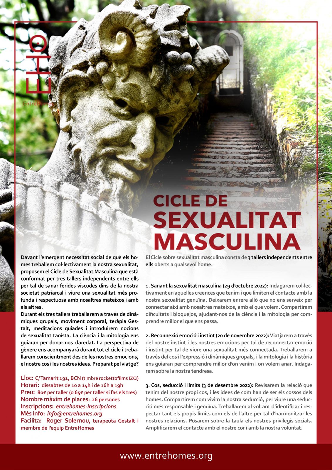1. Sanando la sexualidad masculina (29 de octubre 2022): Indagaremos colectivamente en aquellas creencias que tenemos y que limitan el contacto con nuestra genuina sexualidad. Dejaremos atrás lo que no nos sirve para conectar así con nosotros mismos, con lo que queremos. Compartiremos dificultades y bloqueos, ayudándonos de la ciencia y la mitología para comprender mejor lo que nos ocurre.